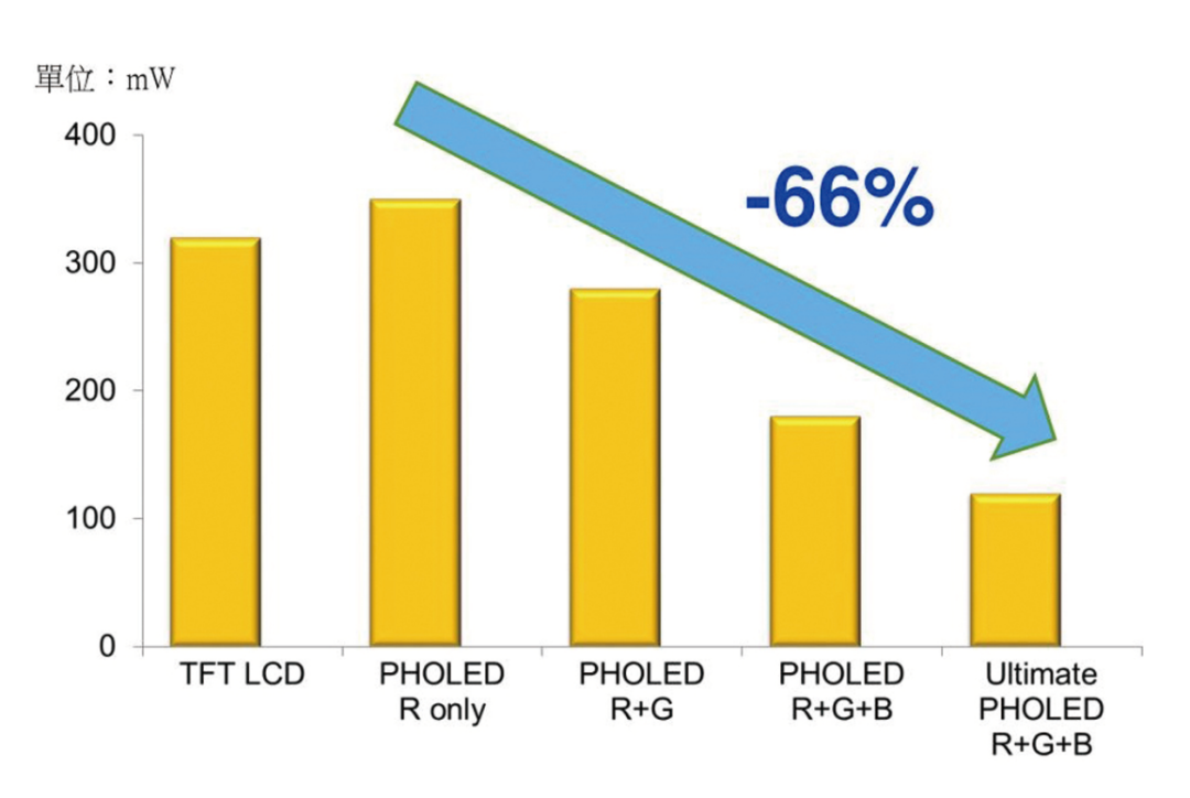 PHOLED(磷光有机发光器件)是有机发光二极管(OLED)的一种,它的效率可以高达传统荧光OLED的4倍。OLED是单片固态器件,通常由被两层薄膜导电电极夹在中间的一系列有机薄膜组成。如果在OLED上加电,导电载流子(空穴和电子)将从电极注入到有机薄膜。然后,在电场的作用下,这些载流子在器件内部迁移,直到复合形成激子。一旦形成,这些激子或激发态,将通过发光和/或发热的方式下降到较低的能级。利用传统的荧光发射,只有大约25%的激子能量会转化成光,而其余的75%会以热的形式损失掉。通过使用某些磷光材料,UDC公司在普林斯顿大学和南加州大学的合作伙伴在20世纪90年代末发现,高达100%的激子能量可以转化为光。PHOLED技术和出色的PHOLED材料都是要实现低功耗OLED显示和照明所必不可少的。PHOLED的外量子效率和发光效率是荧光OLED材料的4倍,因此也减少了产生的热量并增多了AMOLED背板的选择。这一点提供了使得OLED能够与LCD以及传统的光源相抗衡的重要优势。PHOLED也可以在非常低的电压下工作,这进一步增强了它们的低功耗特性。令OLED电视更明亮更节能高效的关键在磷光,特别是PHOLED技术的改进。业界多年来一直在研究从蓝色OLED到磷光的转换,因为它可以大幅提高效率,以便在相同的能量水平下实现更高的亮度,或在降低能量水平的情况下实现类似的亮度,又或介于两者之间。