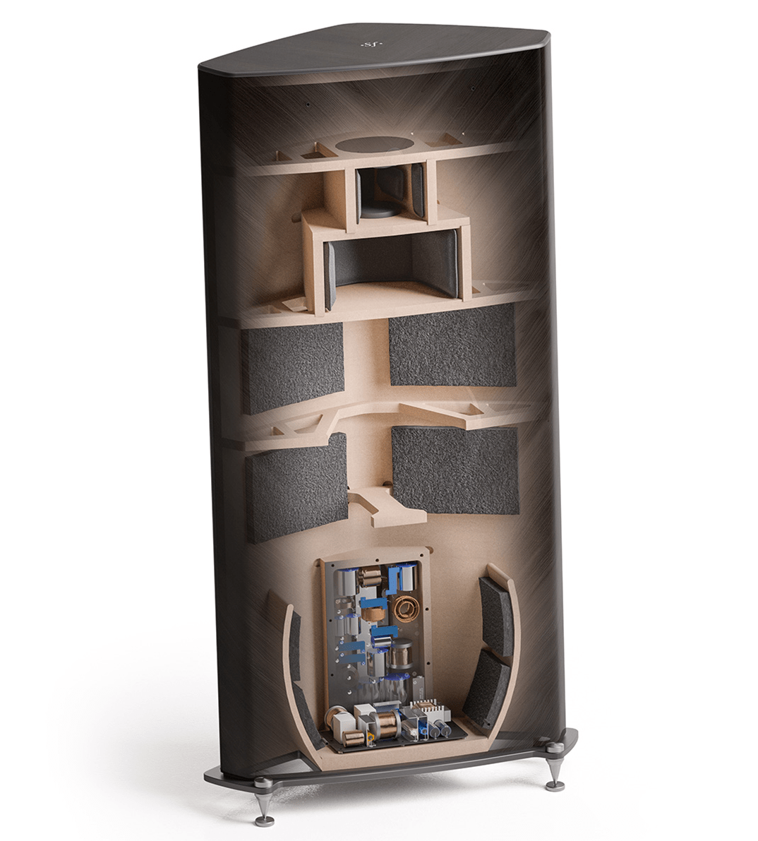 INTONO技术 基于对谐振腔的研究和对中音声学箱体的校准钻孔两个创造性研究,INTONO技术保证了在中频范围内声音最自然的再现。扬声器运动造成的空气弹簧所产生的能量由INTONO管道引导并减少,大大减少了分频器的尺寸和过滤元件。 有机形状 由势霸团队自主研发设计的新STRADIVARI至尊名琴低音扬声器框体,具有独特的有机形状几何特征,其不对称结构作用于扬声器膜产生的振动模式,使框体具有反谐振功能。这是一个融合了机械和美学的结晶,有机印记是该技术元素的灵感之源,与势霸每件产品为打造自然之声的理念完全一致。 相位协调分频器 得益于声场中音乐元素的三维感知,IFF拓扑结构与 "相位一致 "理念相结合,为听众提供了一种身临其境的听觉体验。无源滤波器的所有组件都是由势霸研发团队精心筛选、挑拣和确定尺寸:最终获得的是即使在非常高的聆听水平上也不会出现失真。 沙漏型结构技术 STRADIVARI至尊名琴使用的反射系统结合了新的沙漏型几何结构,旨在最大限度地提高低频下降时的性能表现,同时容纳管道的长度,以及确保在空间内最大自由度定位的声音散发。低音扬声器的箱体内非平行壁设计可以有效防止在调谐频率之上形成的驻波。该技术的使用是势霸团队精心模拟和研发的结果,我们唯一的目标就是达到原声再现的最高技术水平。 低频调节器 LFA系统,或称低频调节器,实现了对超低频范围调谐的全面控制,并优化了房间的响应,能够获得前所未有的声音体验。通过具有优雅设计的解决方案,在尽可能少的干扰而快速有效地完美融入STRADIVARI至尊名琴设计中。LFA技术的灵感来自于对箱体中驱动器的谐振峰的补偿,以便能够获得低频段的阻尼,而不需要引入与信号串联的电阻元件。 势霸已经在参考级音响中引入了超低频调节系统,如Aida阿依达和Lilium䔧琴,随后演变为LFA与Aida II,在STRADIVARI至尊名琴上使用的是在机械层面上更新和完善后的衍生产品。 在与接线柱相邻的电路板上,创建了一个四针系统:用跳接线连接到中央单元的一个公用和三个外围,三个组成中的每一个都允许你设置不同的低频响应。
