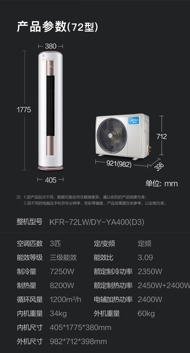 其中的3匹72机型RFD72WGAR于2005年推出,至少2010年以前的版本采用谷轮VR30涡旋压缩机,只用1020m3/h的循环风量达到了3.20的能效比,在当时3匹柜机普遍五级能效电老虎的市场中鹤立鸡群,因此还流行过好一阵子呢。