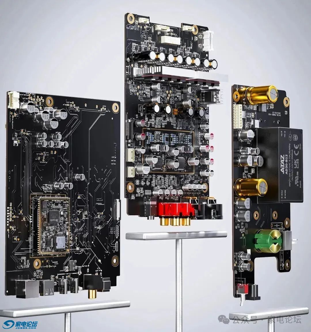 - 高端用料:主板采用8 颗红宝石薄膜电容 + 32 颗晶圆电阻确保低温漂、低噪声;高品质绿宝石固态电容具备超低 ESR,抗干扰能力强;2 颗 nichicon 3300uF 音频专用电容 + 4 颗 ELNA MILIC II 电容 + 8 颗 ELNA RA3 音频专用电容,提升声场表现;4 组无氧铜镀银连接线,确保信号高保真传输,低损耗。