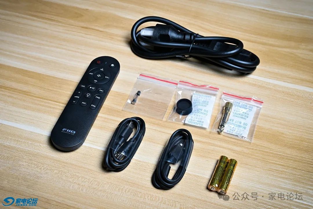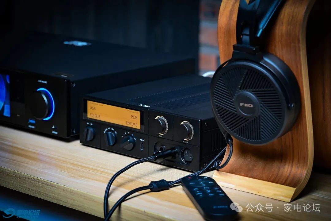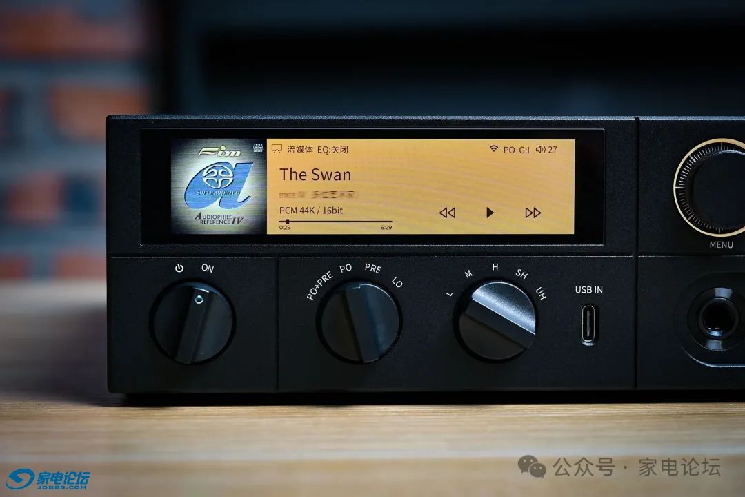 近距离桌面使用时,金属旋钮调节音量、切换输入快捷精准,搭配可自定义的多彩背光灯,既实用又具个性化;而 3.93 英寸全贴合触摸屏,以 240*1020 分辨率呈现清晰的 UI 界面,支持多种主题切换,操作逻辑简洁明了,日常功能触控响应灵敏,不易误触。值得一提的是,PEQ 调节需通过飞傲官网网页端的设置页面,或 FiiO Control APP 实现,借助 APP 还能解锁更多高阶玩法。此外,机器标配红外遥控器,与 FiiO Control App 形成互联,让用户躺在沙发上也能轻松调整参数、切换曲目。这种 “旋钮 + 触屏 + 遥控 + App” 的四重操控体系,在同价位机型中堪称独一档的存在。
