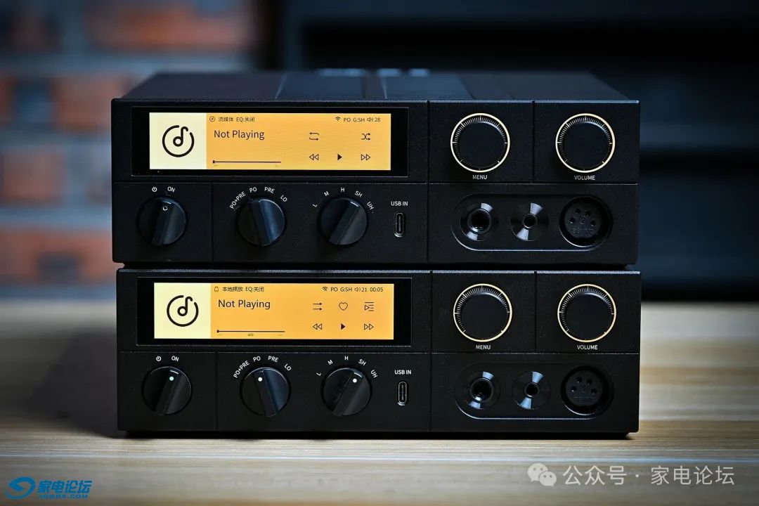操作区域的设计堪称点睛之笔:3.93 英寸 LCD 触摸屏默认采用黄底黑字的复古 UI,像极了老式台的仪表面板,滑动时的过渡动画带有微妙阻尼感,仿佛在操作一台精密仪器。屏幕下方的三颗实体旋钮更具巧思 —— 从左到右分别对应电源开关、输入选择、与增益控制,每颗旋钮都有均匀的阻尼反馈,旋转时发出 “咔嗒” 的机械声,这种物理交互带来的操控精度与满足感,是纯触控设备无法替代的。