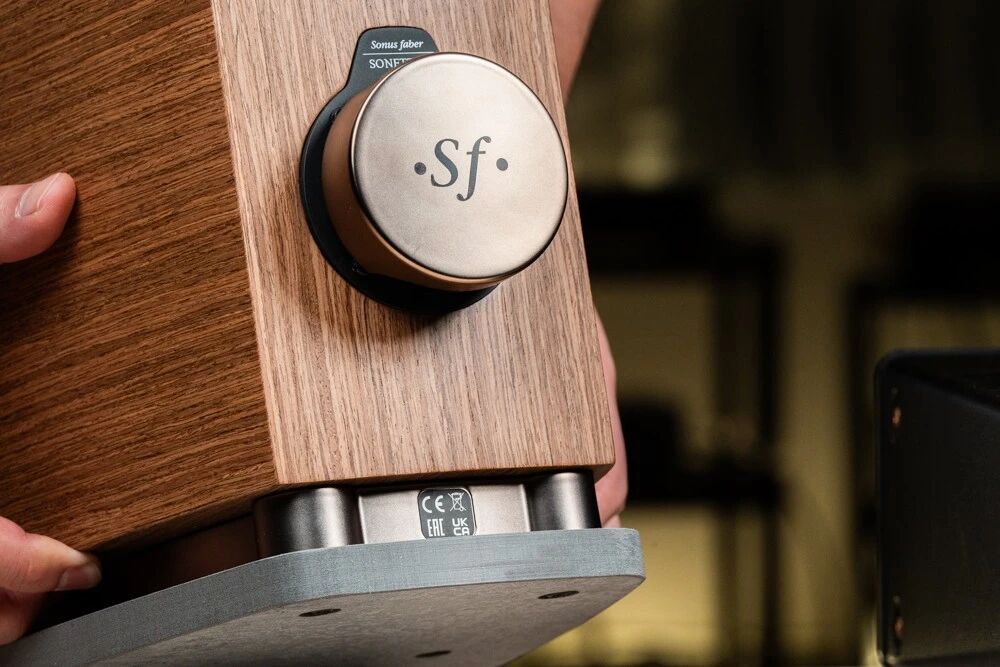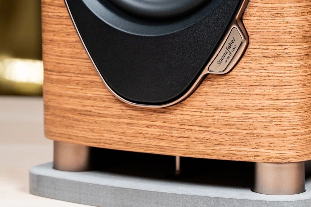 Sonus Faber 多年以来建立起的设计元素之一,就是尽可能让高音和中低音靠近一些,并以一个近似菱形的皮革材质作为装饰,构成高音和中音的模块化形状。有趣的是,在这菱形的边角外部有一圈金属色的外框,右下侧留了一块铭牌,上面标注着 Sonus Faber Made in Italy。这个设计有没有让你产生某种既视感呢?不觉得很像是皮件、皮包的设计吗?意大利人果然懂设计。