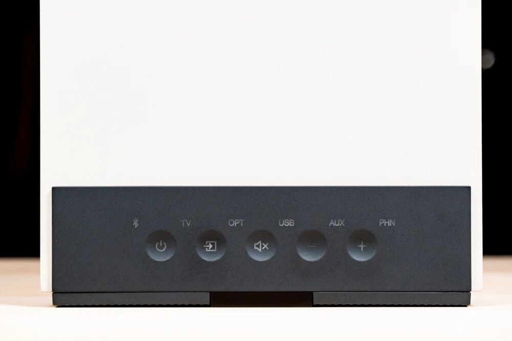人机界面设计好用 对总编来说,Coda W 的人机界面做得很好,主音箱顶部有五个软性按键,由左至右分别是电源、输入切换、静音、降低音量、提高音量,在按键上面有六个输入档位指示灯号,由左至右分别是蓝牙、TV(HDMI)、OPT(光纤)、USB、AUX(模拟)与 Phono(黑胶),按输入切换键可在六个输入档位之间循环设定。