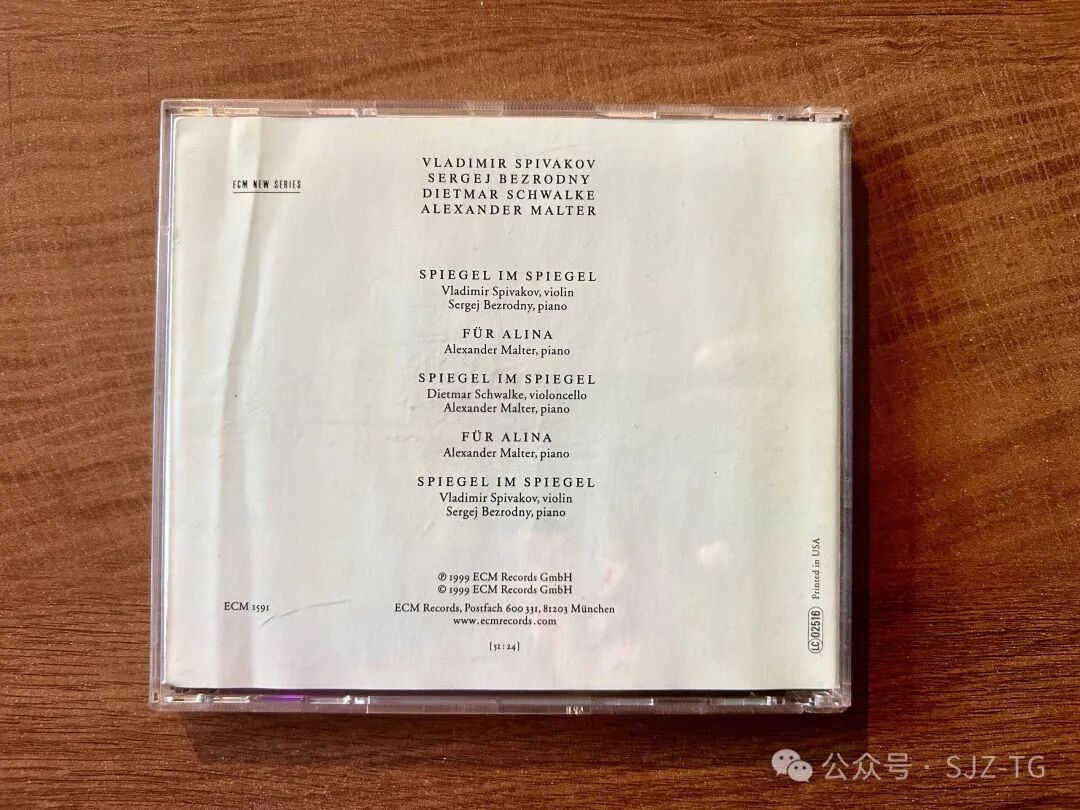 尽管通过“tintinnabuli风格”与Spiegel im Spiegel密切相关,但当直接并置时,Für Alina表现出强烈的差异。人们越是倾听帕特冥想的基本原则,即即使是最简单的手段也足以产生差异,这些差异就越明显。大提琴变小提琴和二重奏成为独奏只是次要意义;整体概念的关键区别在于处理时间的不同方式。与严格的《Spiegel imSpiegel》镜中镜不同,FürAlina献给阿丽娜没有固定的节拍或速度。与标记“平静、崇高、倾听内心自我”相结合,长度不确定的声音真的就像在呼吸——为了一个自由的、个人的时间概念。作为另一个因素,高音在严格的参数范围内是自由组成的。一个额外的不确定性因素是,在开始时敲击的踏板点与其他声音结合在一起,在钢琴中产生嗡嗡的泛音和朦胧的共振 这首简短的钢琴曲的范围灵活,持续时间仅为两分钟,帕特鼓励即兴创作:亚历山大·马尔特强调了这种自由感,他的演奏风格似乎超越了时间。钢琴家“倾听内心自我”的方式给听众留下了一种自发的、声音本身存在自主性的印象。在这张CD中,帕特选择了马尔特几个小时的“即兴创作”的两个阶段,并将其插入Spiegel im Spiegel的三种诠释之间。