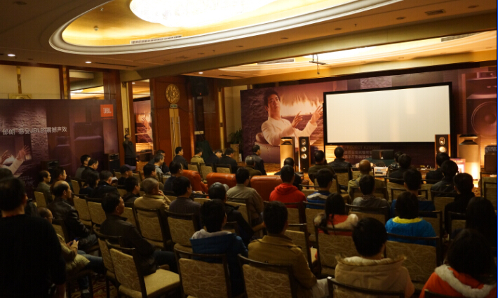 奥图码投影参加南宁音响展,活动现场观众正在欣赏奥图码投影机播放的影片